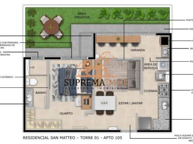 1 dormitório sendo suíte (Bancada granito e Lavatório em louça )